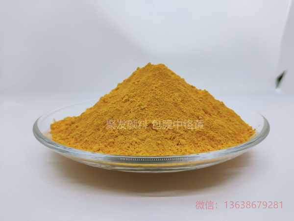 包膜中铬黄索引号P.Y34,主要成分为铬酸铅的颜料,是在中铬黄基础上对其进行包膜处理。包膜处理是将包膜材料紧密的、均匀的包覆在铅铬黄的每个颗粒表面,从而起到对铅铬黄颜料的保护作用,减少铅铬黄颜料与外界的接触,进而提高铅铬黄的耐光性、耐候性,耐温(250℃)等方面等性能,提高颜料的整体品质。本产品避免与有酸碱性或者硫化氢等还原物质混合使用。